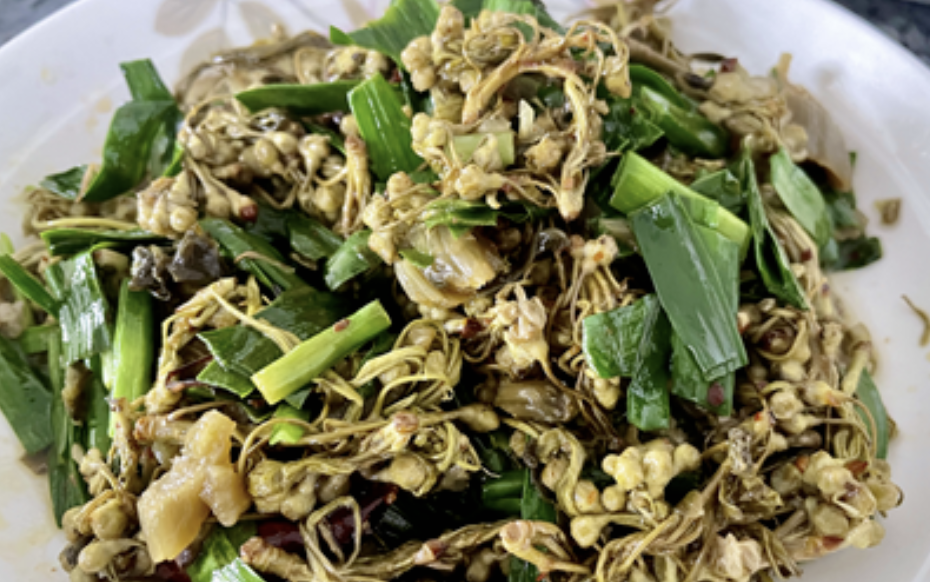 棠梨花是西南山野的春日时蔬,常与韭菜同炒。吃起来清香扑鼻,不苦不涩,即便细品也只有一丝若有若无的微涩,口感嫩滑无渣。许多市场直接售卖焯好的棠梨花,买回即可烹饪,省去了处理的麻烦。