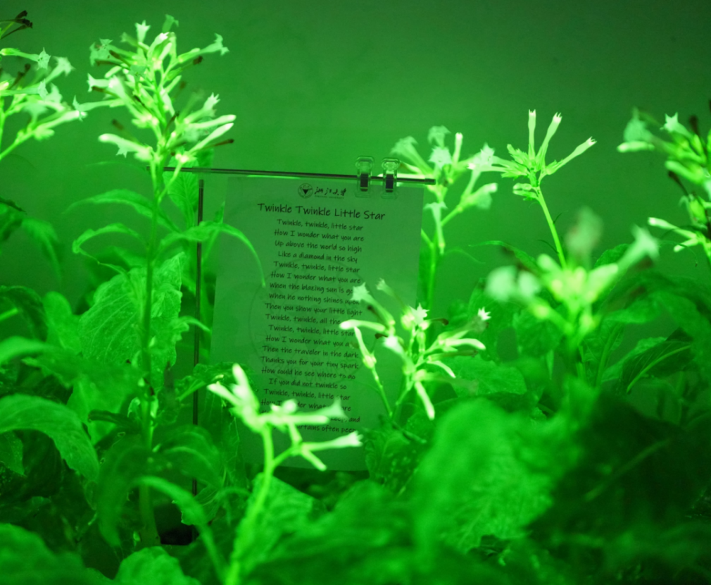 浙大团队研制的发光植物,发光亮度能使人清楚看到后面的小字
