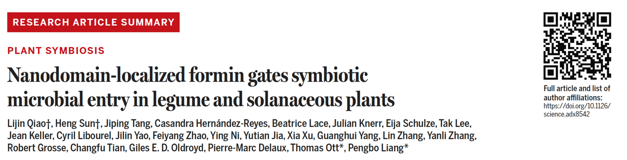 2026年3月5日,中国农业大学生物学院梁鹏博团队在《科学》(Science)发表了Nanodomain-localized formin gates symbiotic microbial entry in legume and solanaceous plants的研究论文,揭开了这套通路里的“开门密码”。该研究发现,豆科植物蒺藜苜蓿中Formin家族蛋白SYFO2介导的根瘤菌胞内侵染分子机制,以CSSP类基因的共生演化为线索枢纽。该机制不仅是豆科植物与根瘤菌共生所必需,也主导着豆科植物和非豆科作物番茄中菌根真菌的胞内侵染进程。
