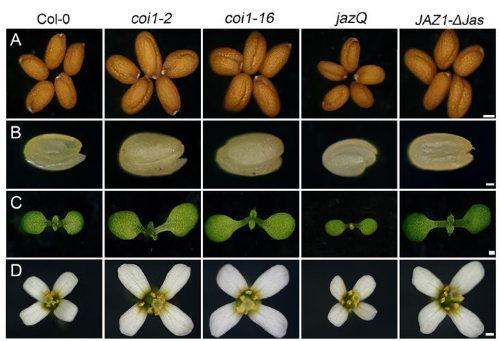 与此相对,JAZ蛋白能够抑制茉莉酸信号。如果JAZ蛋白的功能减弱(jazQ),茉莉酸信号就会相对增强,这就会导致种子变小;反之,如果JAZ蛋白持续存在并保持活跃(JAZ1-ΔJas),茉莉酸信号就会受到压制,种子则会比正常情况更大。不同植株的实验结果一致显示:茉莉酸信号的强弱,会直接影响拟南芥种子的大小(参考文献[7,8])。