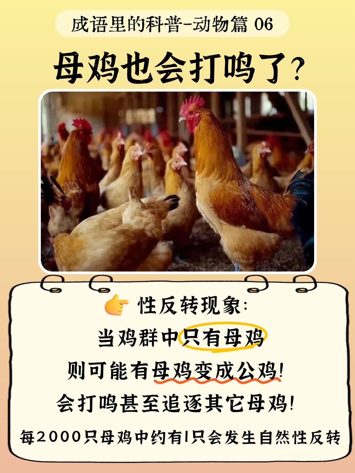 "牝鸡司晨,家之不详"——还记得《甄嬛传》里大臣们跪地痛陈"熹贵妃若为皇太后,必致牝鸡司晨"吗?古人眼中颠覆纲常的凶兆,竟藏着鸡界的生存黑科技! 【宫斗剧预言成真?母鸡真的能"夺权"!】 • 现象实录:当鸡群失去公鸡,每2000只母鸡中就可能有1只会"变性"(性反转现象)——褪去灰褐羽毛,长出鲜红鸡冠,每天清晨准时打鸣,甚至追着其他母鸡"求偶"! • 科学真相:这不是被狐狸精附体!而是母鸡启动"应急繁殖程序":卵巢退化→睾丸发育→雄性激素暴涨,3个月完成性别重塑 • 进化智慧:野生鸡群失去公鸡时,性反转能快速恢复繁殖能力,堪称"种群续命符" 【鸡界性别大反转:ZW系统的神奇操作】 • 染色体玄机:母鸡ZW染色体自带"反转开关",公鸡ZZ却难变母鸡(类似人类女性XX难变男性XY) • 可育之谜:虽然精子质量只有正常公鸡1/5,但依然能生出健康小鸡——生命总能找到出路! 【从宫斗诅咒到生存英雄:母鸡的逆袭】 • 古代误解:商纣王听信妲己被比作"牝鸡司晨",实则母鸡变性是为保护鸡群 • 现代启示:养殖场最头疼的"刺头鸡",竟是自然界最伟大的"救世主" • 医学彩蛋:鸡的性反转机制,正在帮科学家攻克人类性别发育障碍难题! 冷知识暴击: 性反转母鸡的打鸣声比公鸡尖细,像被掐着脖子的电音版 它们依然会下蛋!但蛋会越来越小,最后完全变成"公鸡模式" 下次听到牝鸡司晨这个词,别再联想到宫斗阴谋啦!这是3000万年前就写进基因的生存法则——当环境需要突破性别时,生命永远会给出最野性的答案! 你还知道自然界那些会出现性反转现象的动物呢?欢迎在评论区留言~ 版权归原作者所有,如有侵权,请联系我们