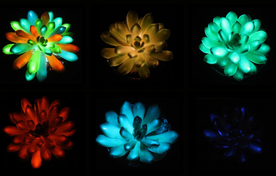通过改变不同的磷光材料,多肉植物还能发出黄色、红色、蓝色和蓝紫色等不同颜色的光,不管你喜欢冷色调还是暖色调,单色还是复色,总有一款适合你!