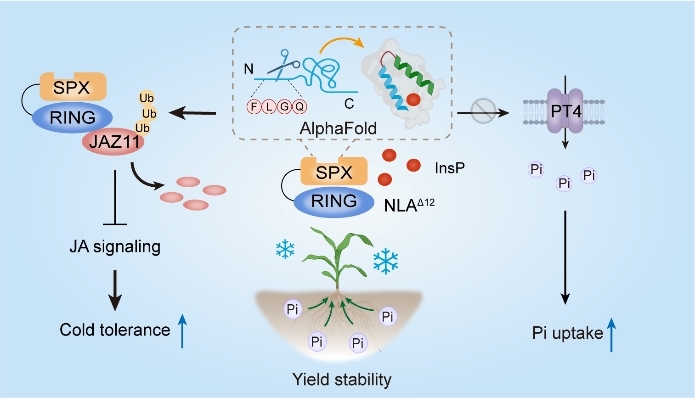 研究团队通过系统筛选玉米SPX家族成员,最终锁定关键调控因子NLA。它像一个“分流阀门”,低温条件下,NLA蛋白积累,一方面降解玉米体内抑制抗寒信号组分JAZ11,提升玉米耐冷性;另一方面会通过自身的特殊结构,识别并泛素化降解磷转运蛋白PT4,抑制根系对磷的吸收。